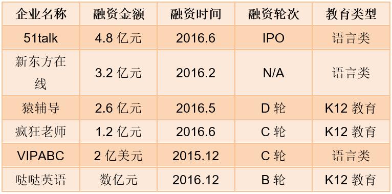 此外,更多资本参与到在线教育公司的融资中。2016年9月,K12在线教育平台作业帮宣布获得6000万美元B轮融资,投资机构包括纪源资本(GGV)和襄禾资本。同月K12课外教育平台课外喵获得A轮3000万元融资,投资方主要由业内知名的新三板教育企业和专业财务投资机构组成;10月学乐云教学宣布完成数千万美金的C轮融资,由新天域基金领投,金沙江创投、华新世纪投资集团持续跟投。