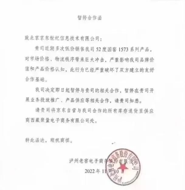 在低价压力下,平台破价,酒企破防。2022年双十一期间,因为京东“多次低价销售52度国窖1573系列产品”,泸州老窖甚至和京东公开“翻脸”,暂停合作。