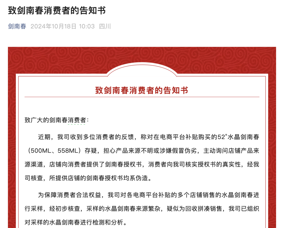 10月18日,剑南春在官方微信公众号发布《致剑南春消费者的告知书》,其中提到,近期收到多名消费者的反馈,对在电商平台补贴购买的52°水晶剑南春(500ML、558ML)存疑。经核实,相关平台店铺提供的剑南春授权书系伪造。