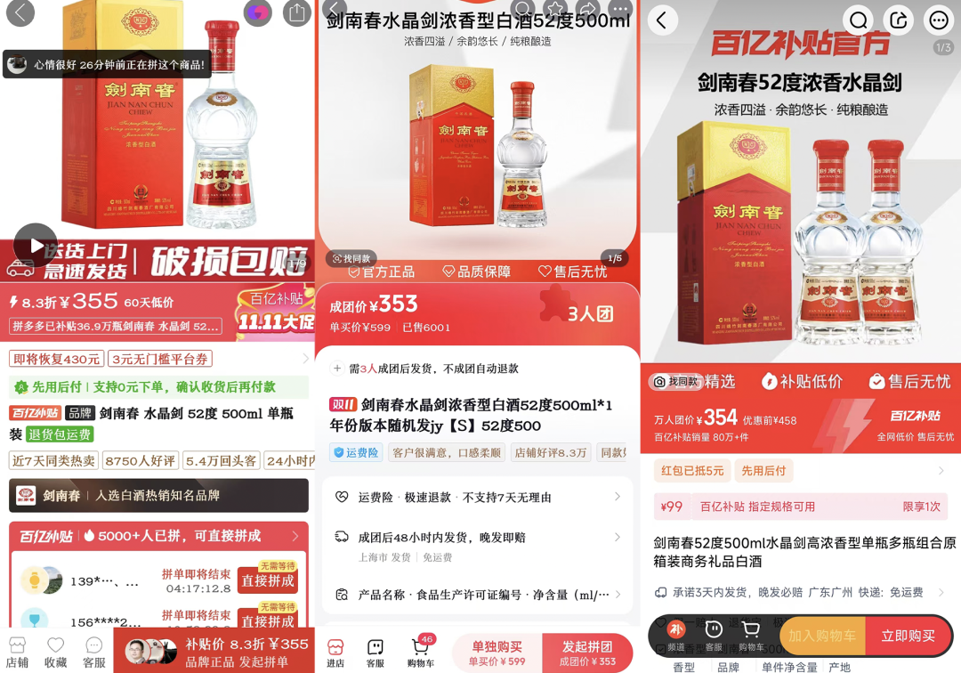 酒讯进入多家电商平台查询商品了解到,在拼多多平台,通过“百亿补贴”入口,52° 500ML水晶剑价格低至355元/瓶;在抖音平台,通过“超值购”入口,该产品成团价为353元/瓶;在天猫平台,某店铺经“百亿补贴”后,该产品售价为358.5元/瓶。