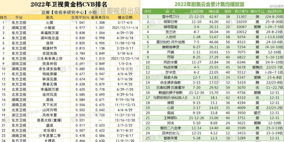 网播数据优于电视收视。《风吹半夏》云合集均6000w+的播放量,位于2022年剧集榜的第十名。但因为网播剧的整体数据一年不如一年,把《风吹半夏》和今年剧集相比,也能到前三,跟赵丽颖古偶剧《与凤行》的表现差不多。