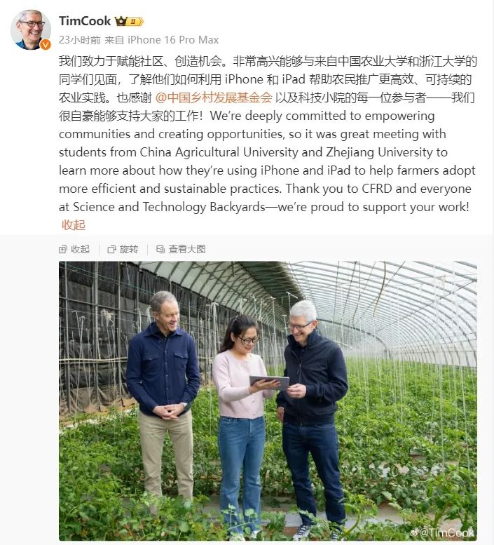 这些行程与感慨,都以中英文双语的方式更新在库克的微博账号里。