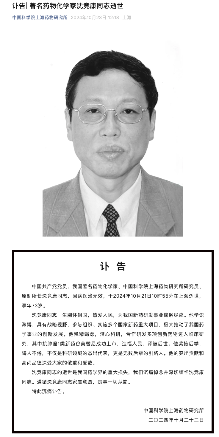 10月23日,中国科学院上海药物研究所发布讣告:中国共产党党员、我国著名药物化学家、中国科学院上海药物研究所研究员、原副所长沈竞康同志,因病医治无效,于2024年10月21日10时55分在上海逝世,享年73岁。