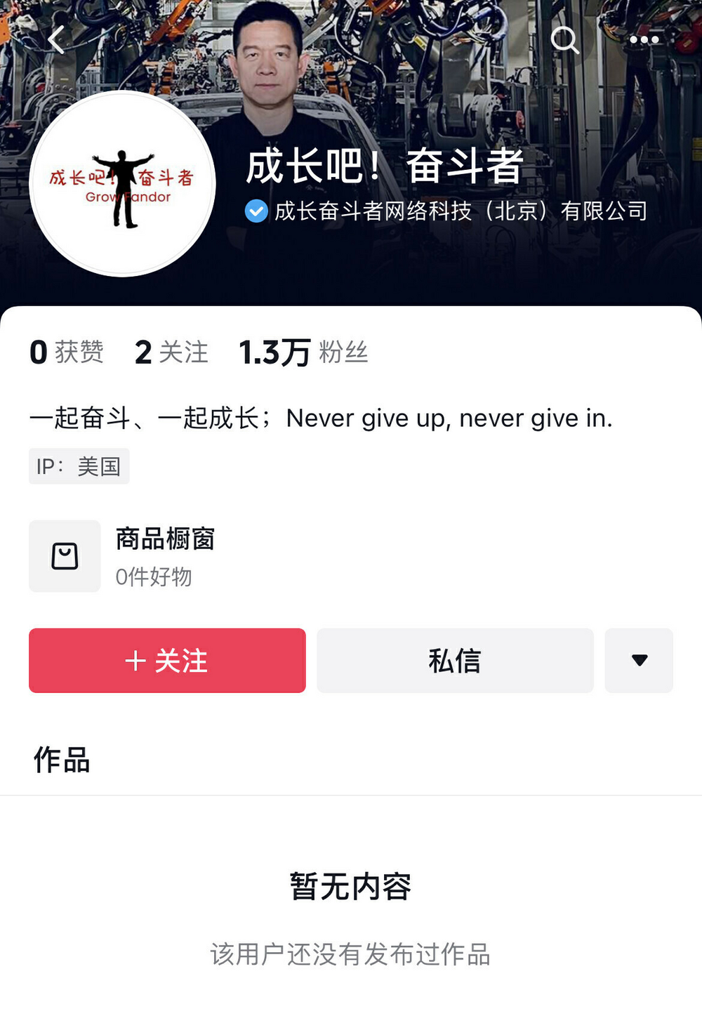 目前,“成长吧!奋斗者”账号已经在中、美各社交平台启动。DoNews尝试在抖音平台搜索“成长吧!奋斗者”关键词,发现其粉丝数仅为1.4万(截止10月16日),据每日经济新闻报道,其商品橱窗曾上新199件商品,涵盖纸巾、衣服、鞋、化妆品、生抽等,但目前商品橱窗已被清空。