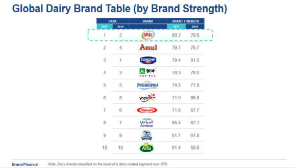 在国际品牌价值评估权威机构Brand Finance公布的2017年度Brand Finance全球乳制品品牌价值排行榜中,伊利取得了亚洲第一的优异排名。其品牌强度指数,更是位居全球第一。这创造了亚洲乳企迄今为止的最好成绩。与此同时,全球知名传播服务集团WPP发布的2017年度BrandZ™中国最具价值品牌100强榜单中,伊利同样强势登顶,蝉联食品类品牌价值第一。