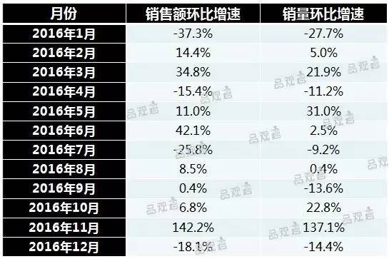 >>2016年1月-12月洁面网络零售销售额及销量环比增速