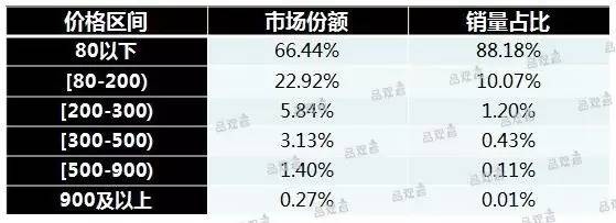 看完了卖得最好的品牌和单品,我们再来聊聊消费者的偏好,在这一部分品观君会分享到价格区间、系别、适用肤质和主要功效4个方面的数据。