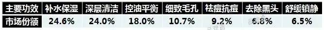 和适用肤质的选择一样,消费者在洁面产品的功效选择上也足够细分,除了上述3大功效,细致毛孔、祛痘抗痘、去除黑头、舒缓镇静4类功效也各自占据了6.5%—10.7%的市场份额。
