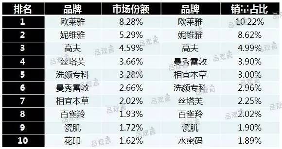 上表是两个维度的线上洁面TOP10品牌排行榜,无论是市场份额还是销量占比的维度,欧莱雅、妮维雅、高夫都牢牢把持着TOP3的位置。