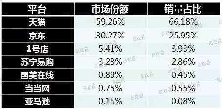 可以看到,无论是市场份额还是销量占比来看,天猫和京东都稳居冠亚军,二者市场份额占比达到了89.53%、销量占比更高达92.13%。
