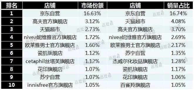 这里面品观君主要关注到三点:京东自营以超过16%的市场份额和销量占比稳居第一;高夫官方旗舰店和天猫超市争夺第二、第三的位置;欧莱雅男士官方旗舰店进入TOP5。后两点都说明了一个现象——线上男士洁面市场不容小觑。