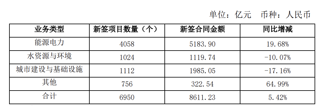 中国电建10月23日公告,2024年1月至9月,公司新签合同金额8611.23亿元,同比增长5.42%。按业务类型,能源电力业务新签合同金额5183.9亿元,同比增19.68%;水资源与环境业务1119.74亿元,同比降10.07%;城市建设与基础设施业务1985.05亿元,同比降17.16%;其他业务322.54亿元,同比增64.99%。按地区分布,境内合同金额6851.21亿元,同比增3.13%;境外合同金额1760.03亿元,同比增15.42%。