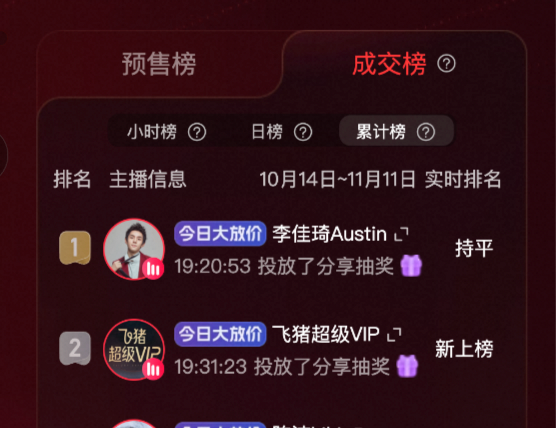 以飞猪为例,其与万豪、雅高、希尔顿、迪士尼、环球影城等议价权最强的商家具有强绑定关系,淘宝场域内的分发效果显著——10月21日,飞猪官方直播间的淘宝直播排名仅次于李佳琦。