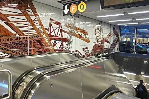 63 街站,三层楼的墙面分别贴了瓷砖、玻璃马赛克和覆膜玻璃,韩裔美国艺术家简·辛(Jean Shin)以此为材料创作了《高架铁路》。这一作品展现了这条地铁线的历史:手扶梯入口处交错的起重机记录了1940年代拆除第二和第三大道高架铁道的场景;电梯旁的墙上,上世纪的绅士淑女与衣着新潮的来往行人碰撞着美国的变迁。