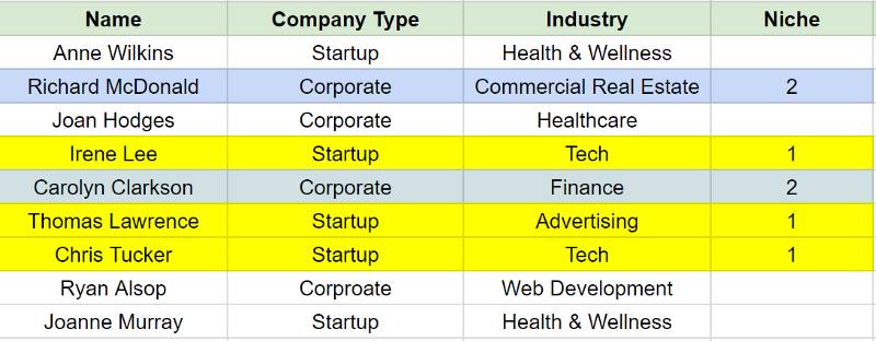 让我们回到我们之前的电子表格,仔细观察一下我们高亮显示的名字列表。你需要将它们按帮助你的可能性程度来进行一个排序。然后我们从头到尾一个一个联系。
