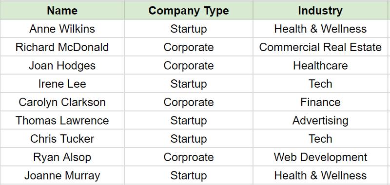 把这些人添加到我为你制作的这个表格中,同时填上他们的公司类型和所在行业。(暂时忽略 Email 这一行,我们稍后会提到)