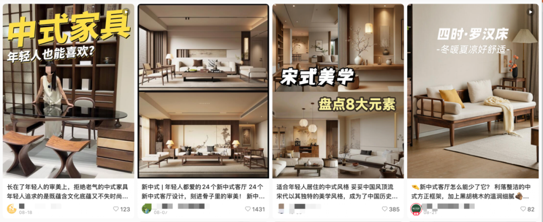 家居市场也是“新中式”消费风潮发展最为自然的领域。根据千瓜数据的调查显示,2023年“新中式家居”的流量持续增长,在小红书的相关种草笔记数增长超63%,月均互动达百万级,新中式家具市场也在不断成熟,除了木质家具外,其他品类如“壁纸、地毯、床垫”等品类的种草笔记数或互动量增长也超300%。