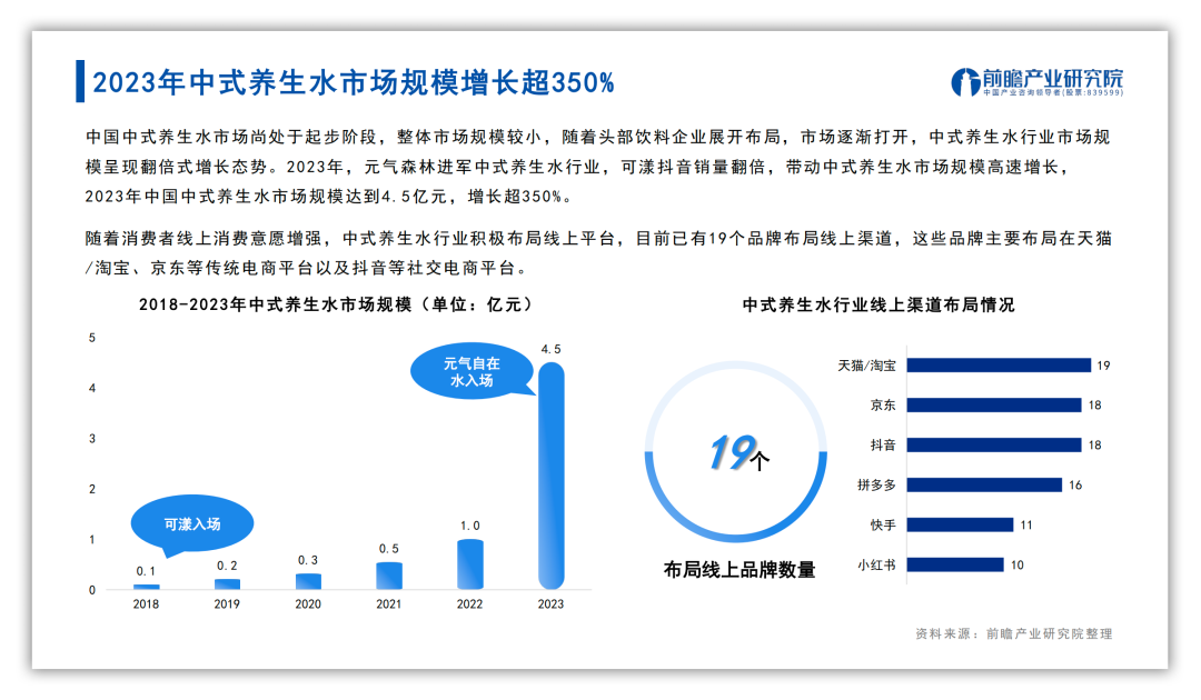 在现制茶饮行业以及便利店商超,以天然草本植物、水果或药材为原料,通过煮制、萃取等工艺制成的“中式养生水”也开始刷存在感。根据前瞻产业研究院发布的《2024年中国中式养生水行业发展趋势洞察报告》显示,2023年中国中式养生水市场规模达到4.5亿元,同比增长超过350%,预计至2028年可达到破百亿元规模。