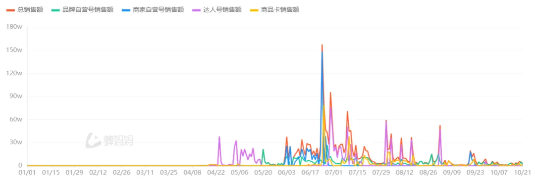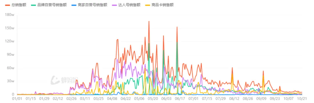 以林源春为例,品牌抖音销售额暴涨的4—7月,也是品牌推广达人数、推广直播场次飙升的时间段。而8—9月品牌推广力度减弱,则对应着该时间段内较低的销售额。