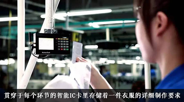流水线上每件产品的颜色、款式、面料都不同,它们都挂有自己的“身份证”,工人只要将其在自己面前的识别终端轻轻一扫,这件衣服的信息及制作要求全都一目了然。