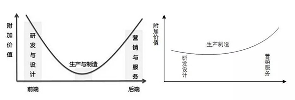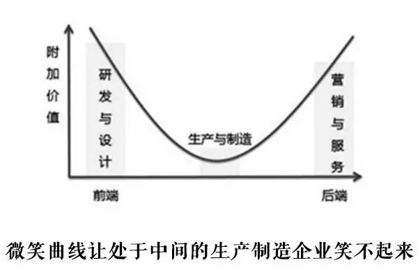 服装业运营主要有三个环节:研发设计、加工生产、品牌渠道运营。这条价值链上的利润分配约为:研发设计占35%,品牌渠道运营占55%,加工生产占10%。这就是大多数制造行业的微笑曲线,即,生产制造环节处于价钱链的最低端,拿到的回报最少。