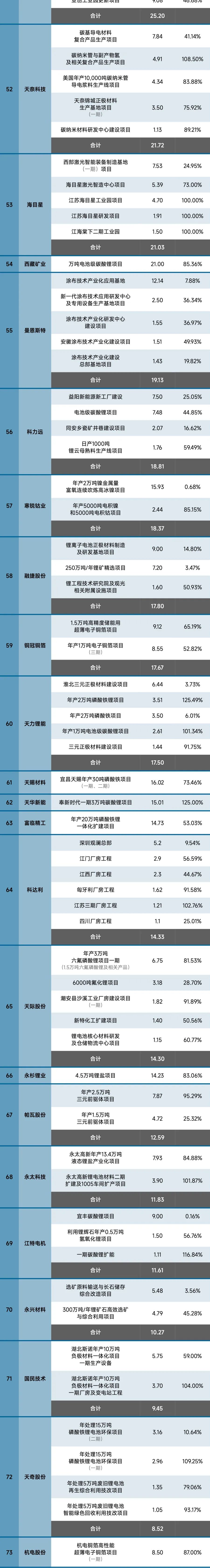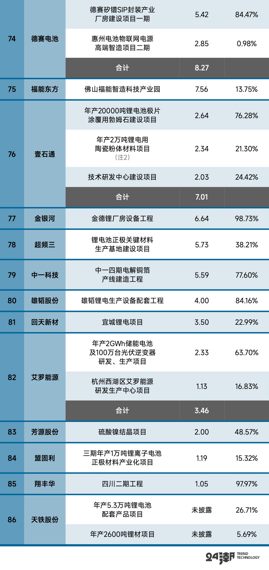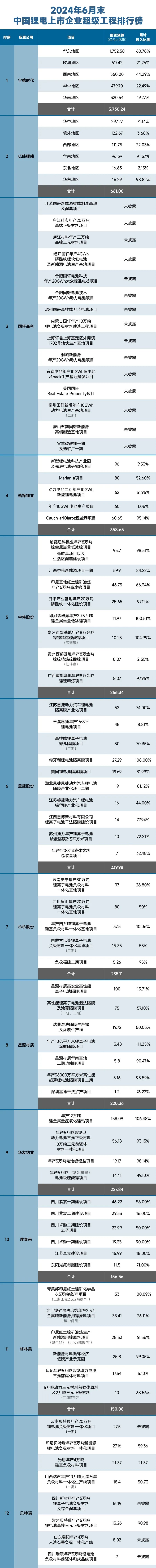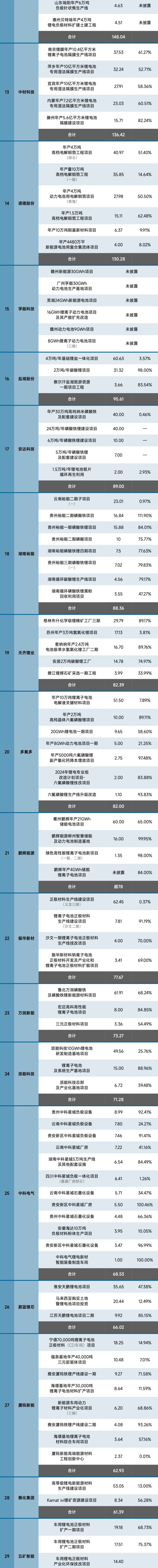 据24潮产业研究院(TTIR)统计,截止2024年6月末,国内86家锂电上市企业的340个超级工程(单个项目投资预算在亿元以上)进入执行(施工)阶段,这340个项目总投资预算超9500亿元,涵盖锂电池制造、钴锂镍等上游原材料、正负极材料、电解液、锂电隔膜、锂电铜箔等整个锂电池产业链。