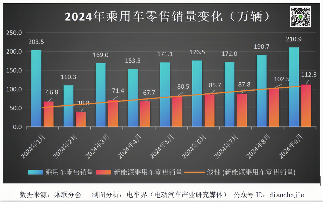 (1) 1-9月国内乘用车累计销量1557.4万辆,1-9月新能源乘用车累计零售销量达713.2万辆,同比增长37.4%,已经接近23年全年771万辆的数据。