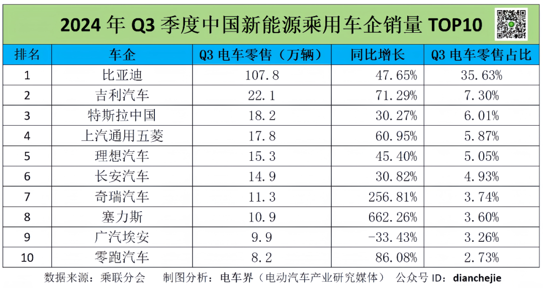 在市场集中度方面,2024年第三季度,新能源乘用车市场前10家车企的零售份额达到了78.11%,显示出市场的高度集中。