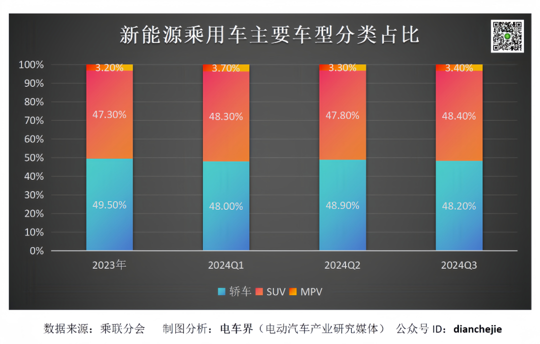 2024年新能源轿车和SUV市场份额均在48%左右浮动,MPV仅占据3.5%左右市场份额。