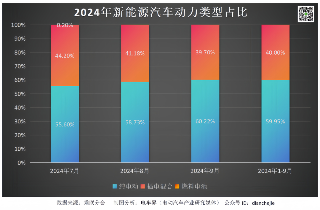 到了2024年Q3季度,插电混合动力累计销量超140万辆,同比增长82.24%,远高于纯电动车12.08%的增速。