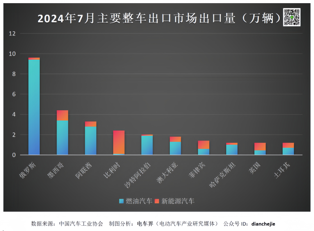 根据2024年7月的整车出口市场数据,比利时、墨西哥和菲律宾是新能源汽车出口的最大市场。