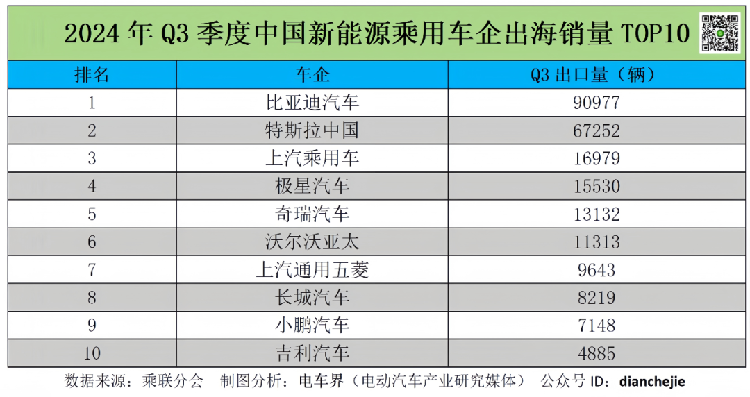 中国新能源汽车出口领域,比亚迪和特斯拉表现突出,二者包办了Q3新能源汽车出口份额的53.5%。