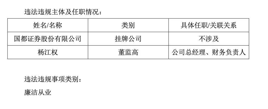 而杨江权作为公司总经理,是落实廉洁从业管理职责的第一责任人,对上述违规行为负有主要责任,北京证监局决定对杨江权采取出具警示函的监督管理措施。