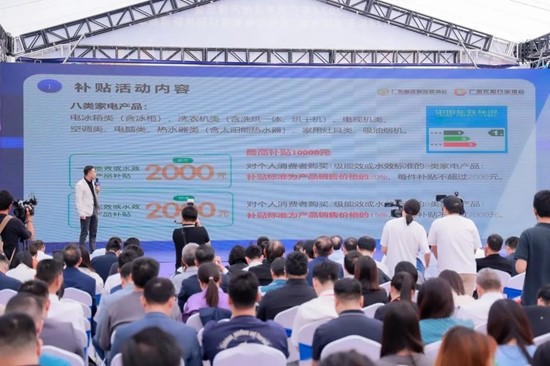 现场特邀广东省汽车流通协会秘书长黄秀彬、广东省定制家居协会秘书长曾勇,分别作“广州市汽车补贴政策宣讲”和“广州市加力支持消费品以旧换新活动介绍(家电、数码、家装厨卫)”。据介绍,广州市针对汽车报废及汽车置换更新给予最高20000元补贴等,电冰箱等八类家电产品给予最高补贴10000元。