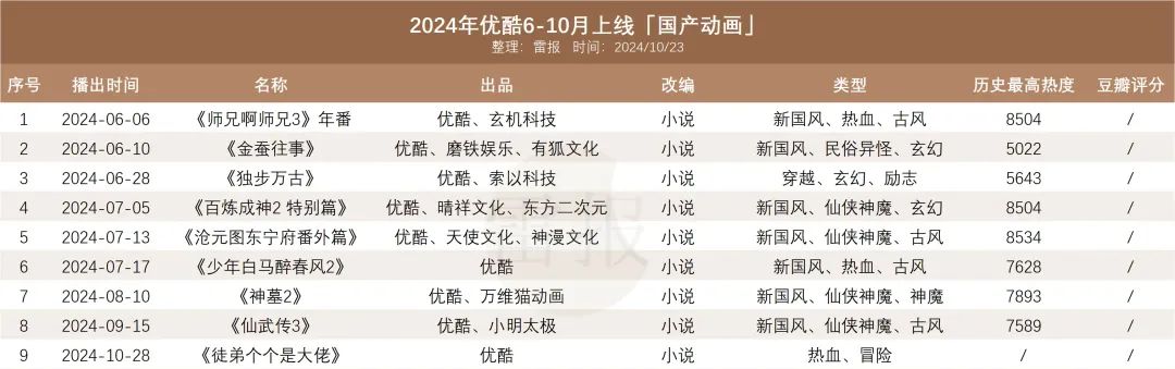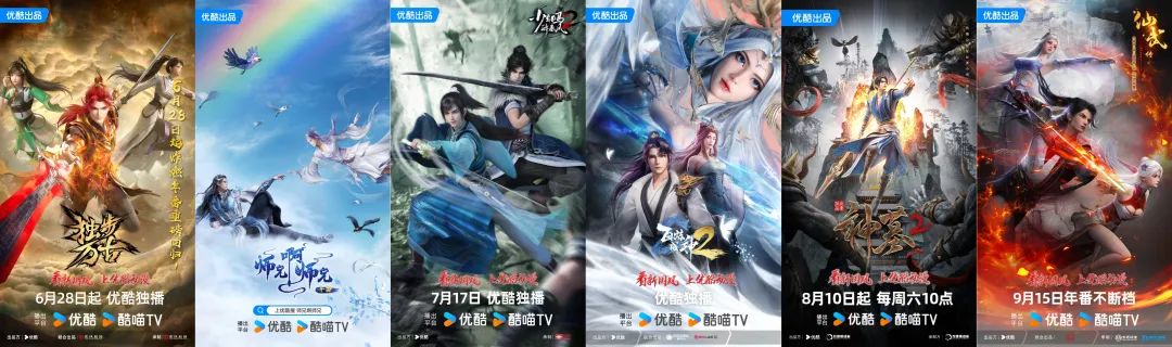 来到2024下半场,优酷动漫发力暑期档,6月至10月期间,上新了《师兄啊师兄3》年番、《金蚕往事》、《独步万古》、《百炼成神2 特别篇》、《沧元图东宁府番外篇》、《少年白马醉春风2》、《神墓2》、《仙武传2》、《徒弟个个是大佬》等一系列国漫,且均为优酷出品的独播作品。