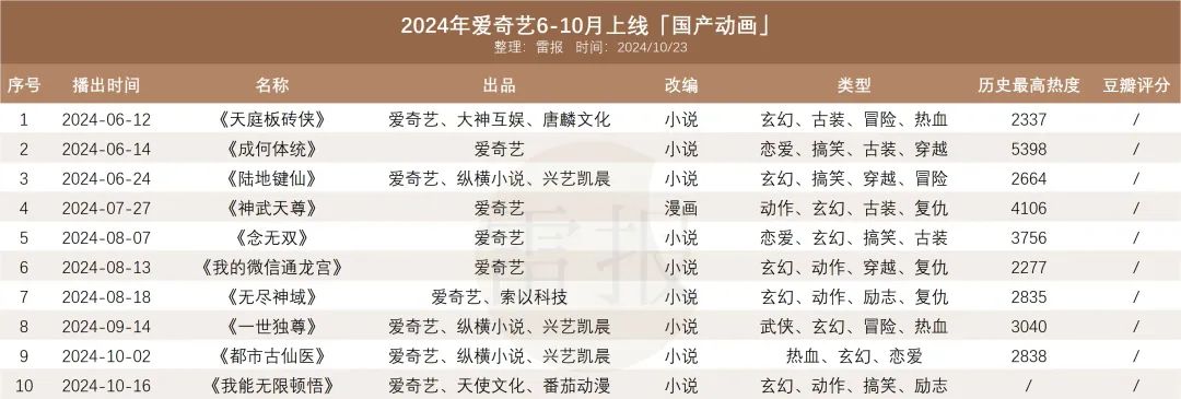 爱奇艺从暑期档至今,打造了《天庭板砖侠》、《成何体统》、《陆地键仙》、《神武天尊》、《念无双》、《我的微信通龙宫》、《无尽神域》、《一世独尊》、《都市古仙医》、《我能无限顿悟》等多部动漫作品,均为爱奇艺独播作品。