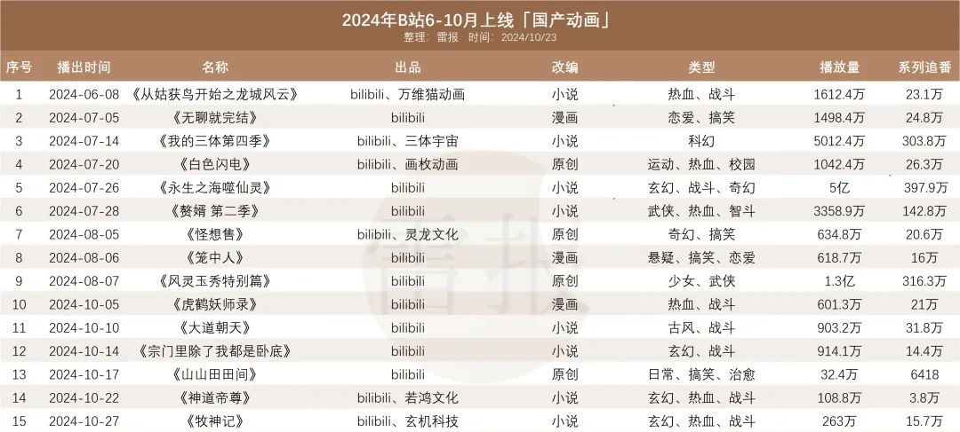 值得一提的是,致力做国创的B站,在这15部新作中只有4部原创作品,其余均为漫画以及小说改编作品。