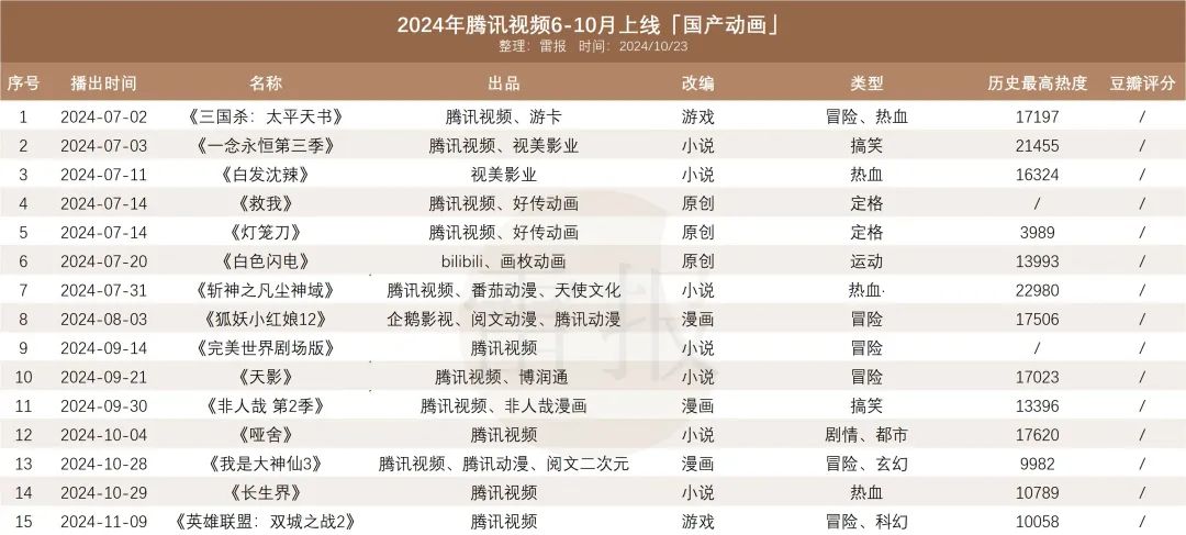 据雷报不完全统计,四大平台在6月至10月上新了至少49部作品,其中各平台独播动画项目达到42部。另外,相比去年平台出品占约7成,今年上新的动画几乎全部由平台出品。可以说,国产动画基本已经完全成为了视频平台之间的竞争。