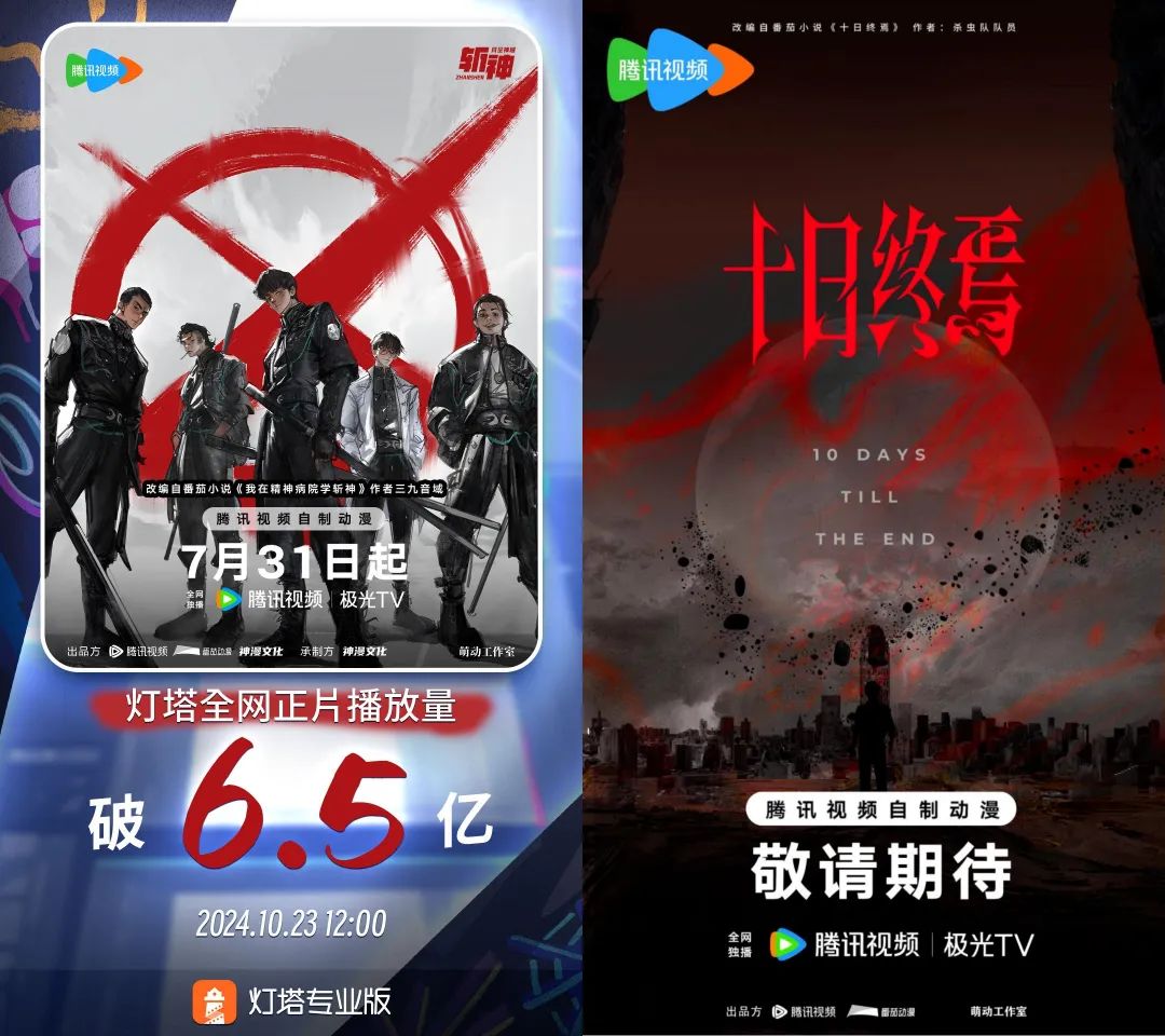 目前,番茄小说已经和腾讯视频合作了多部IP改编动画项目,在8月10日结束的“2024腾讯视频动漫大赏”发布会上,腾讯一口气官宣了60部动漫作品,番茄头部男频IP《十日终焉》即将动画化的消息也冲上微博热搜。