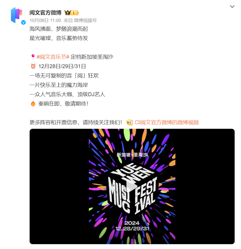 去年年底,阅文花6亿收购了腾讯动漫,相关平台、IP、项目等也来到其名下,IP储备和开发产能进一步扩充。值得一提的是,10月,阅文新官宣了“阅文音乐节”, 定档新加坡圣淘沙,将持续12月28日至31日共计三天时间。