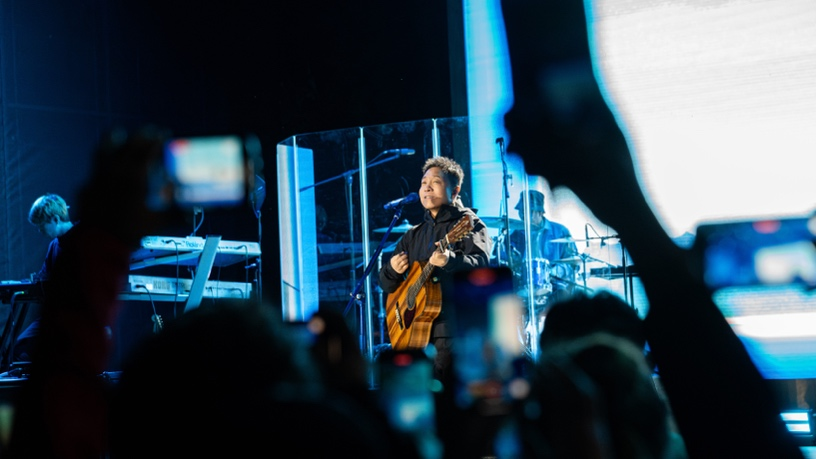 图示:许巍在始祖鸟国际攀岩山地课堂演唱