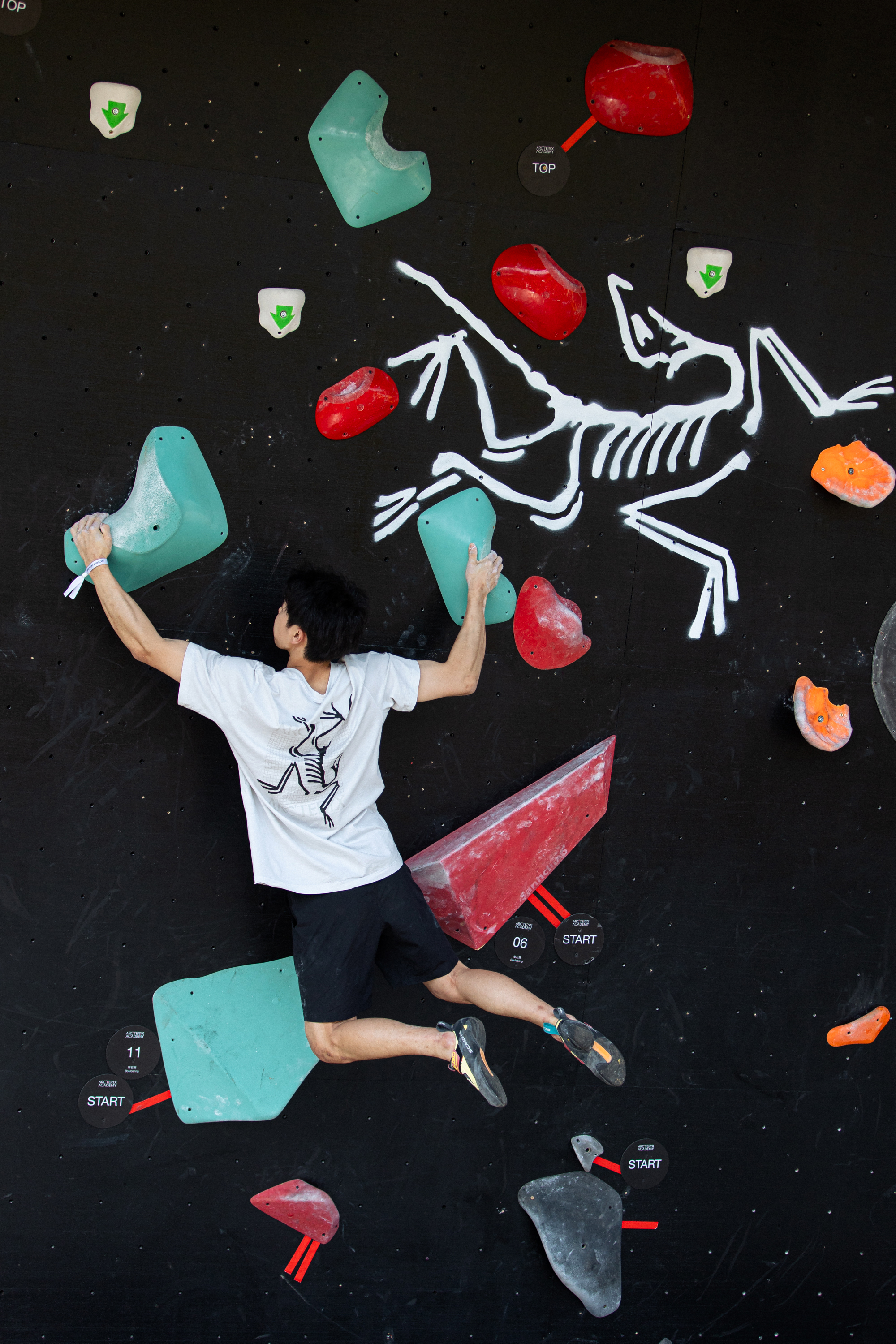 图示:潘愚非正在始祖鸟国际攀岩山地课堂体验抱石墙线路