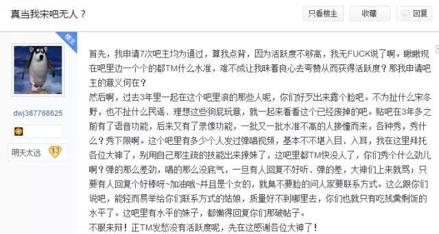 今天我到宋冬野的贴吧里看了一圈,发现里面已经被各种虚假、污秽的小广告占领了,即使时有吧友跳出来感慨“宋冬野吧无人”,可这个局面既然没有改变。