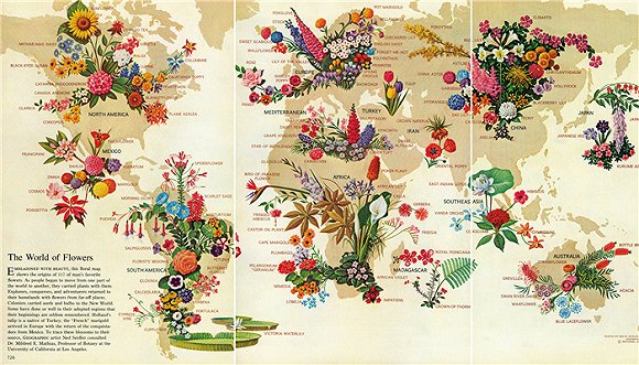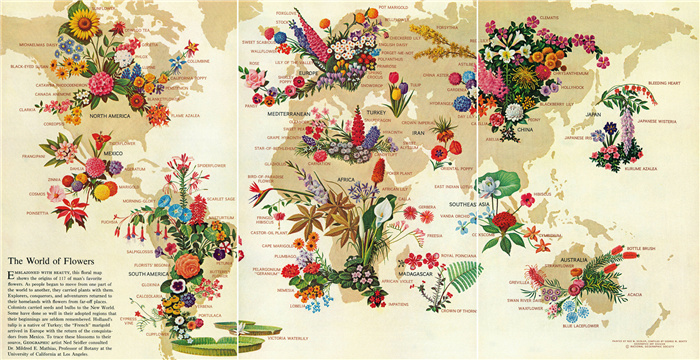 1968年的这张地图展现了“117种最受人类喜爱的花的起源”,随着探险家、征服者和冒险家的全球活动,这些花得以在世界上传播扩散。该图注解写道:荷兰的郁金香起源于土耳其;“法国金盏花”实际上是由殖民者从墨西哥带到欧洲的。为了制作这张地图,地理艺术家内德·塞德勒(Ned Seidler)专门咨询了加州大学植物学教授米尔德丽·E·马蒂亚斯(Mildred E Mathias)。