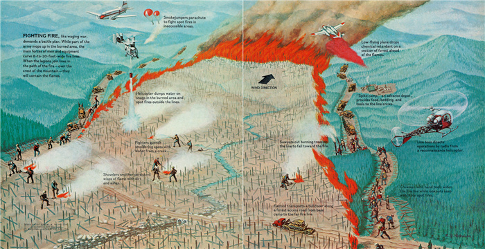 这张由RV·尼克森(RV Nicholson)手绘的插图记录了1960年代扑灭森林大火的方法。下方图说写道:“扑灭森林大火就像是一场大战,需要一个周密的作战计划。”这张图展示的是,林火防护员“建立起一条8到20英尺宽的隔火带,消防员通过这条隔火带阻断林火的绵延至山顶——这样就可以有效地控制火势了。”