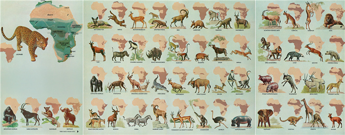 《非洲的动物:行走在大陆上的珍宝》出现在1972年2月的《国家地理》杂志上,作品中的绘画部分由艺术家内德·塞德勒创作,地图由埃利·萨班(Elie Sabban)绘制。简·B·麦康维尔(Jean B McConville)负责整个项目的调研工作,同时也咨询了时任华盛顿国家动物园馆长西奥多·H·里德(Theodore H Reed)。“每张小地图展现了不同动物在1970年代初期的分布情况(绝大多数动物的数量都比现在要多,分布也更广),”塔森出版社的编辑解释道,“其中有一张插图展示了不同种类的斑马分布,这张地图同时勾勒出了它们的主要栖息地。”