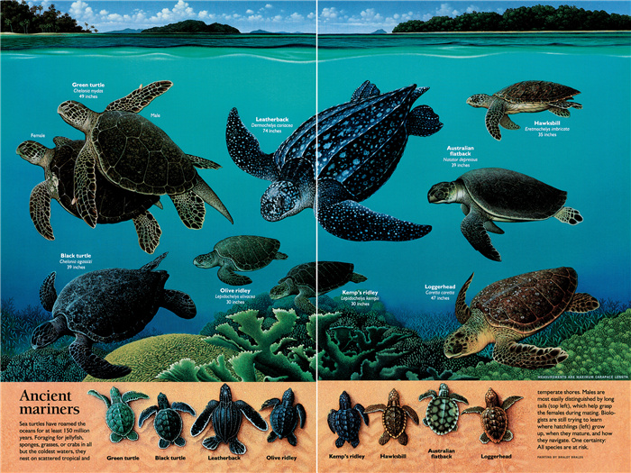 这幅刊登在1994年《国家地理》2月刊上的作品由荷兰艺术家波拉特·博拉兹(Braldt Bralds)创作,它细致入微地刻画七种不同的海龟(黑色海龟被认为是绿色海龟的亚种),这七种海龟都已濒危。