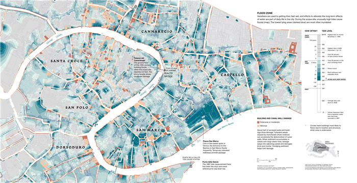 这幅作品的创作者是弗吉尼亚·V·玛森(Virginia W Mason)。图表讲述了威尼斯的洪水问题,海平面上升和城市地基下沉是洪水频发的两大原因。“数个世纪以来,这两个现象让这座城面临着沉没的风险,”塔森的配文写道,“还有些人则认为外来游客才是真正的‘洪水猛兽’:2007年,威尼斯的常住人口为6万人,但是外来游客数量却达到了2100万。”旅游业收入倒也为城市兴建防洪工程提供了资金。2003年,颇具争议的摩西计划(MOSE)开始付诸实践。按照计划,威尼斯将兴建数道防洪水闸,“用来阻断海水涌入威尼斯低地。威尼斯市内多处饱受洪水困扰,其中就包括著名的圣马可广场(是威尼斯海平面最低的场所之一),政府官员希望水闸工程能给威尼斯争取一些时间,但批评人士担心,工程斥资甚巨,并且会对当地的生态环境造成影响。”
