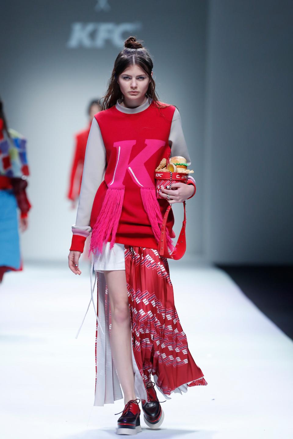 尽管人们对这场时装大秀褒贬不一,不过显然时装秀并不是肯德基的重点——话题度和关注度才是。于是去年他们又和时装设计师C.J.Yao合作登上了上海时装周:模特们穿着写着大K的卫衣,每个人手上都抱着一个装满毛绒食物的外带全家桶。