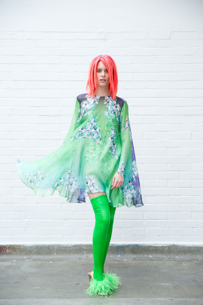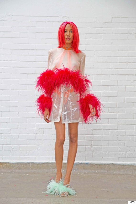 因此这些大众消费品和快餐品牌一直在尝试各种猎奇的跨界营销,比如肯德基就不是第一次“进军时尚界”了——早在2015年他们就与著名设计师Katie Eary合作推出过一场时尚大秀,秀上的时装也有一种微妙感,比如这件肯德基logo配色的羽毛上衣和同样材质的薄荷蓝羽毛鞋,远看像一只火烈鸟:
